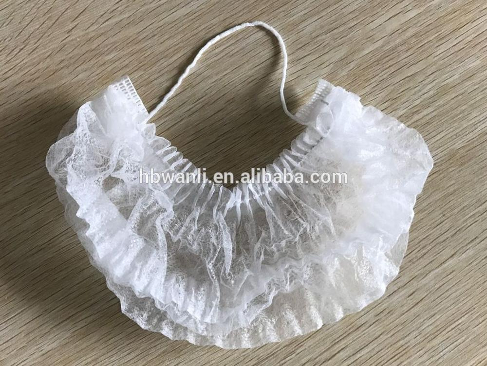 New style disposable PP non woven beard cover with elasticDescription:1. Name: Non woven beard cover3. Material: 10-20gsm4. Color: white, green, yellow, blue, pink (can be customzied)5. Style: single loop6. Size: 18",21" (can be customized)7. Packing: 100pcs/bag, 10bags/ctn9. Mini quantity......